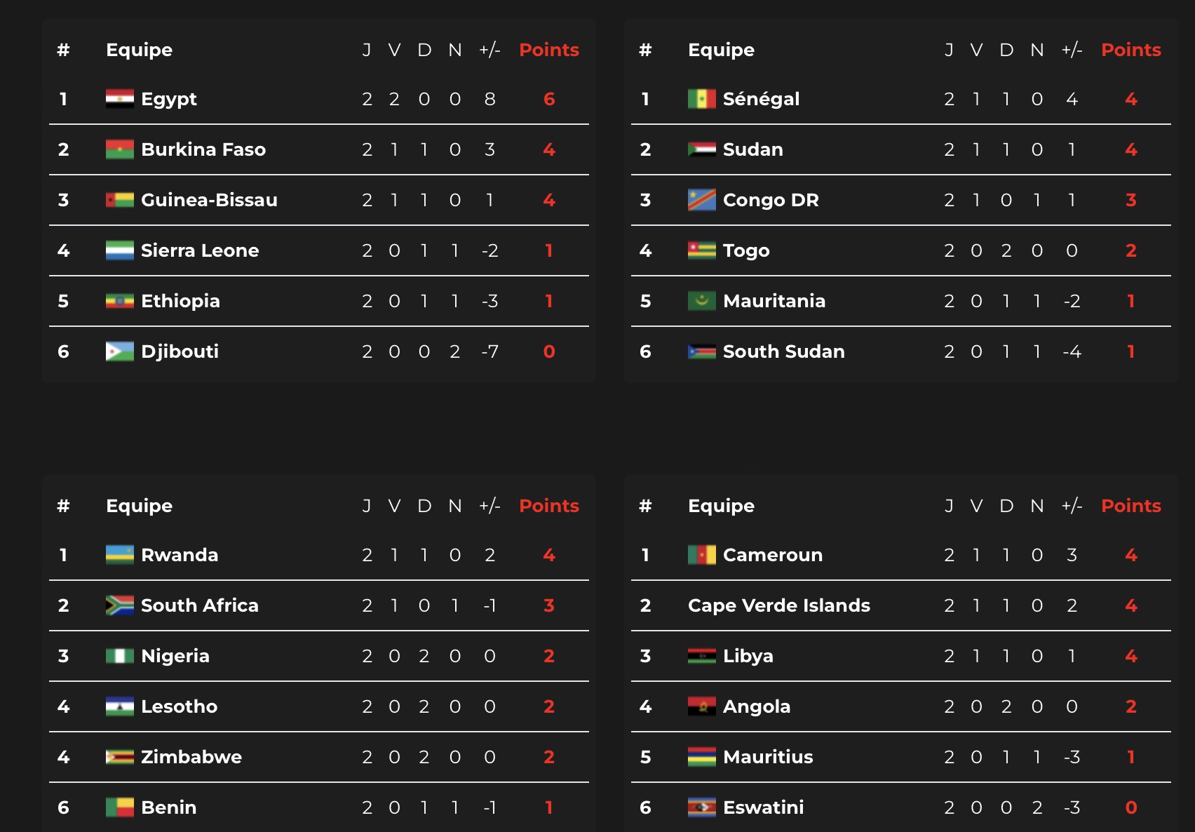 - Groupe D : Cameroun, Cap-Vert, Angola, Libye, Eswatini, Ile Maurice;