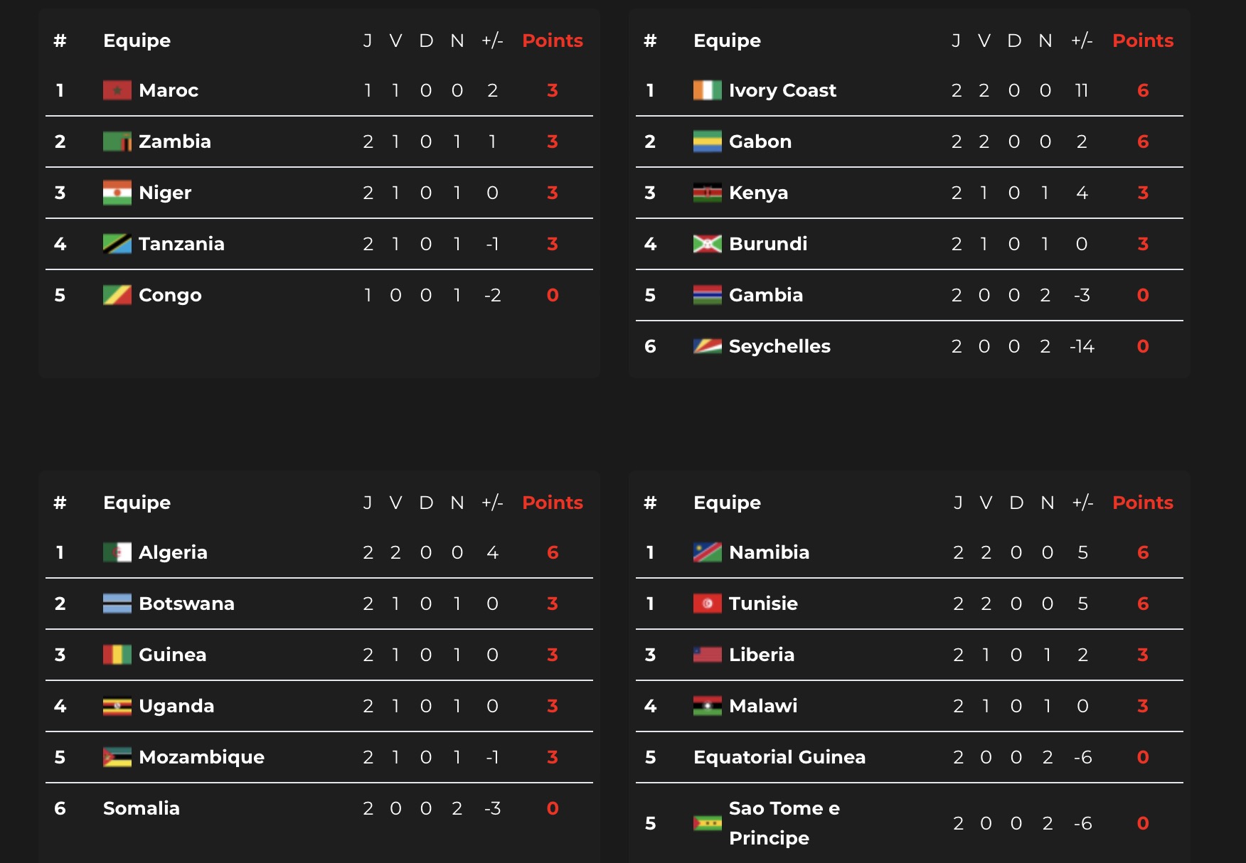 - Groupe E : Maroc, Zambie, Congo, Tanzanie, Niger, Érythrée;