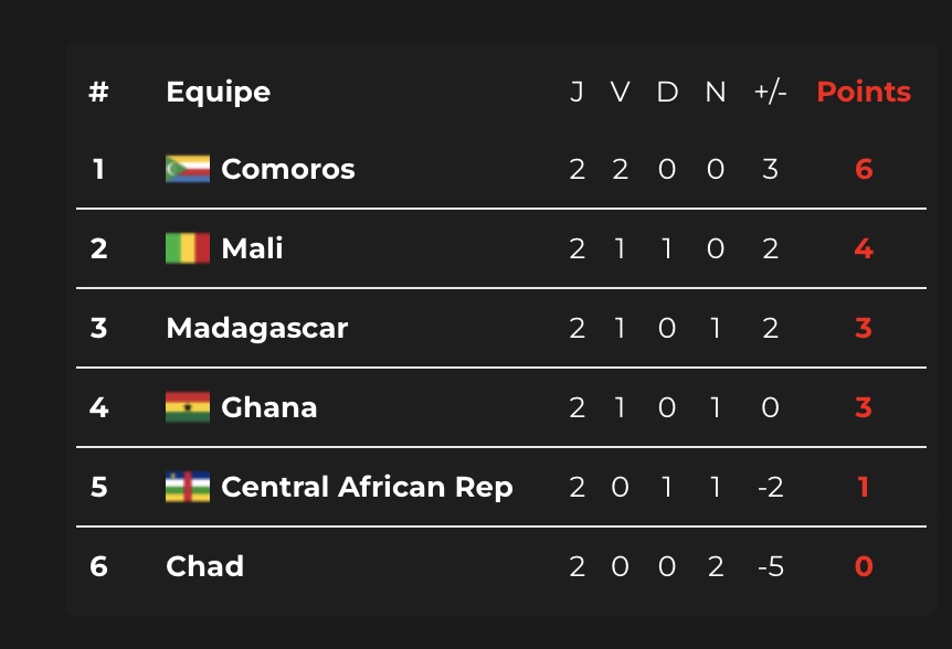 - Groupe I : Mali, Ghana, Madagascar, République centrafricaine, Comores, Tchad;